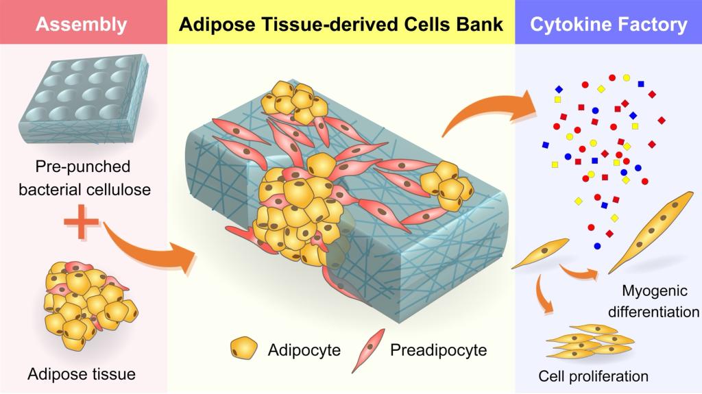 开发适合于体外培养的脂肪模型能为组织修复、代谢疾病及相关的研究提供助力。常规的通过二维平面培养建立的脂肪模型需要额外添加化合物以诱导脂肪细胞的成熟,这种方法较为复杂且大大增加了工业化生产的成本。谭志凯团队在“In vitroadipogenesis and long-term adipocyte culture in adipose tissue derived cell banks”一文中提出了一种采用多孔3D支架建立脂肪模型的方法。通过将分离的脂肪组织接种到合适的支架后,不仅能促进前脂肪细胞的黏附、增殖和成脂分化,而且有助于前脂肪细胞发生显著的自发脂质积累。利用该方法建立的组织来源的脂肪细胞库能够分泌大量促进成纤维细胞增殖和成肌细胞分化的细胞因子,在脂肪重建以及肌肉修复中都具有很大的应用潜力。相关研究成果发表在杂志Biofabrication上(DOI:10.1088/1758-5090/ac0610)。硕士研究生陈昊翔和王小成为论文并列第一作者,谭志凯教授为该论文的通讯作者。