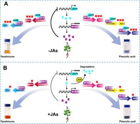 Hortic Res | 开国银/郭新红团队联合解析JAZ9-MYB76复合物介导茉莉酸调控丹参药效物质生物合成的新机制